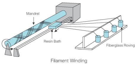 Resin-impregnated continuous strands(woven roving,mat,or impregnated roving) are wound onto a mandrel in specific patterns and then cured to form the finished products,it includes discontinuous filament winding and continuous filament winding.